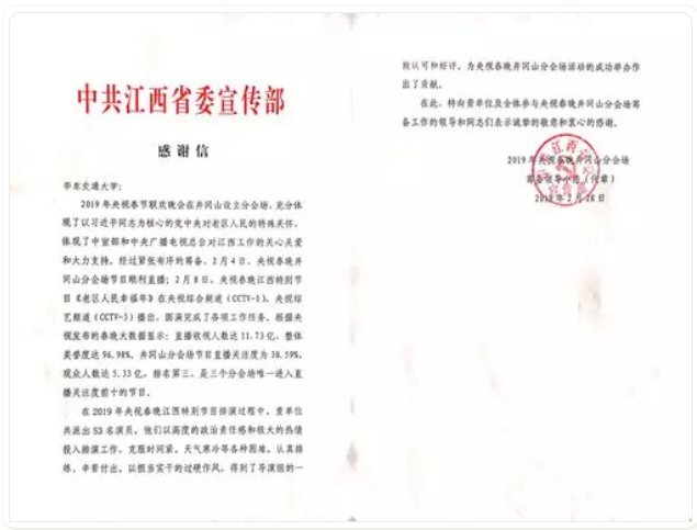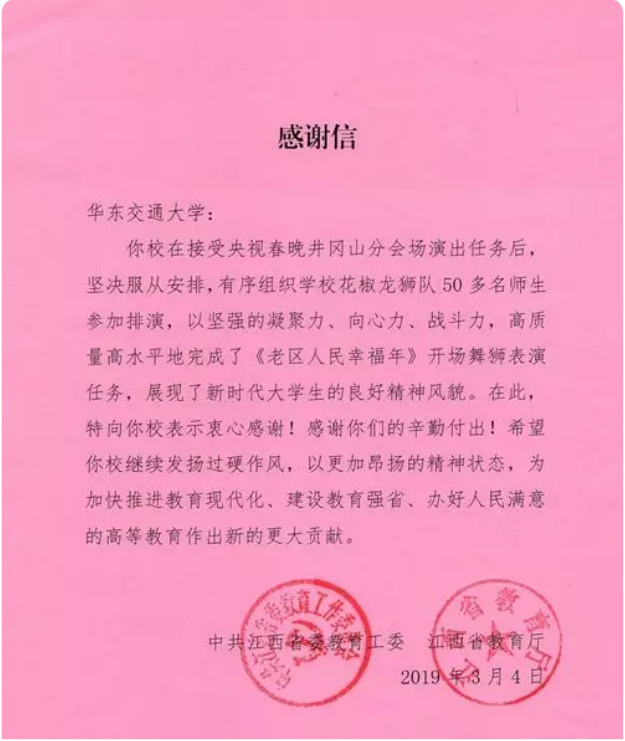 近日,我校分别收到了江西省委宣传部和江西省教育工委(教育厅)的感谢信,对我校“花椒龙狮队”圆满完成2019年央视春晚表演任务给予表扬。