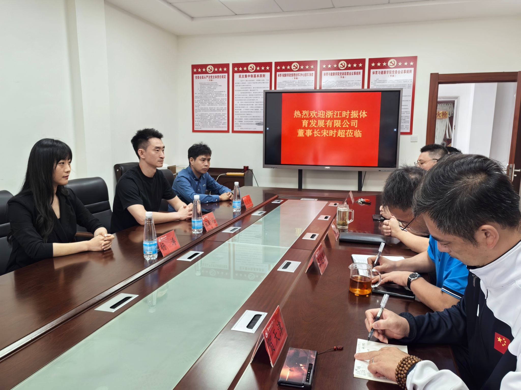 院长邓卫权、院党委副书记王迪旻、院教学助理贺天津等热情接待了宋时超一行,双方就合作事宜进行洽谈。邓卫权向客人简要介绍了我院概况,以及专业设置、学科建设、高水平运动队、人才培养、创业就业等情况。宋时超介绍了公司发展历程,以及从运动员转变为体育企业经营者的心路历程,希望与学校在人才培养、创新创业、实习培训等多方面深度融合、共同发展。双方就合作事宜进行了深入交流,并最终签订合作协议。