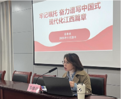 宣讲会上,易修政对习近平总书记考察江西重要讲话精神做了系统梳理和深入阐述,她提出,要充分认识习近平总书记再次考察江西的重大意义,全面理解习近平总书记对江西发展提出的新的战略定位,准确把握习近平总书记对江西发展提出的任务要求,以及进一步推动长江经济带高质量发展的重要要求,深刻把握贯彻落实习近平总书记考察江西重要讲话精神的实践要求。易修政还强调,要切实将习近平总书记考察江西重要讲话精神贯穿于学院的发展过程,使之转化为我们实际行动的纲领,要求全体学生铭记习近平总书记的殷切期望,不惧艰难,勇于开拓进取,以鲜明的政治自觉、深刻的思想自觉和坚定的行动自觉,毫不动摇地走在总书记指引的发展大道上,为学院的高质量发展书写新的光辉篇章。