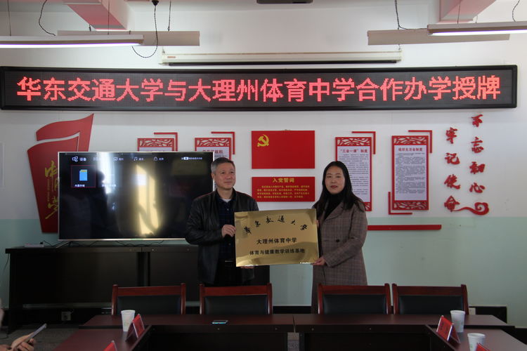 随后,体育与健康学院党委书记李梁华为大理州体育中学授牌“华东交通大学体育与健康教学训练基地”,大理州体育中学校长夏荣接受华东交通大学授牌。