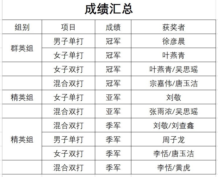 我校青年教师刘敬和刘查鑫分别获得精英组女子单打亚军、混合双打季军。学生周子龙获得精英组男子单打季军,李恬/唐玉洁获得精英组女子双打季军。在群英组的比赛中,我校学生获得全部五个项目中的四个冠军,学生徐彦晨、叶燕青分别获得群英组男子和女子单打冠军,叶燕青/吴思瑶获得女子双打冠军,宗嘉伟/唐玉洁、张雨浓/吴思瑶和李恬/黄虎获得混合双打冠军、亚军和季军。本次比赛是全国业余选手水平最高的赛事,吸引了来自全国各地的245名运动员参加比赛。